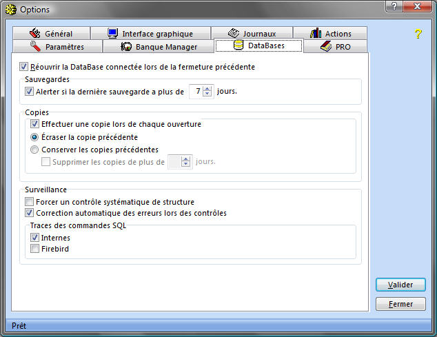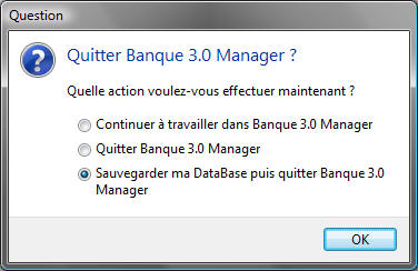 Ci-dessus la fiche Outils + Options, onglet DataBase. La case "Alerter si la dernière sauvegarde à plus de x jours" permet de vous prémunir contre les "oublis" de sauvegarde. Dans ce cas, BanqueManager vous invitera à effectuer une sauvegarde en quittant l'application si le délai est échu ; comme ci-dessous :