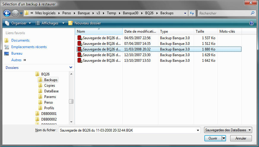 | Comme avec tous les autres logiciels que vous utilisez régulièrement, il est très vivement conseillé d'effectuer des sauvegardes des données. On considère en effet en général qu'il est inutile de sauvegarder le programme (le code source, situé par défaut dans c:\program files\banquemanager) car celui-ci est aisé à retrouver ; par exemple sur l'Internet. Par contre, les données (votre DataBase) qui contiennent toutes les informations que vous avez saisies sont primordiales car non reconstructibles en cas de crash disque, d'infection virale, de problème matériel, etc. Il n'est pas question ici de conseiller ou déconseiller tel ou tel média (CD, DVD, disque dur, clé USB, etc.) ; l'important est bien de sauvegarder et de conserver ces sauvegardes. L'idéal étant de faire des sauvegardes tournantes (plusieurs médias à échanger) ; le risque avec un seul média serait en effet de perdre tout si la dernière sauvegarde est endommagée. On considère ne général que 3 ou 4 médias à utiliser alternativement son le meilleur compromis. Mais cela dépendra bien sûr de vos fichiers, de leur criticité, et de vos moyens ! Cela étant, lorsque l'on perd tout, on se dit souvent trop tard que finalement ce graveur à 50 € n'était pas si cher ! A méditer. D'autre part, et là je parle d'expérience : ne jamais faire confiance aux autres ! Vous pouvez avoir pris toutes les assurances, toutes les garanties que vous voulez avec toutes les sociétés que vous imaginez, en cas de crach chez ces sociétés, c'est vous qui en patissez et il ne vous restera à nouveau plus que vos yeux pour pleurer. Les sauvegardes (à mode) qui consistent à envoyer sur l'Internet vos données sont très bien, mais uniquement en complément. Pour la petite histoire, il faut savoir que le Forum et une partie du Livre d'Or de BanqueManager sont partis en fumée un beau matin de septembre 2007, tout cela parce que mon hébergeur avait eu un (très grave) souci de sauvegarde. Voyons tout d'abord l'étape de la sauvegarde : • 1° possibilité : Sauvegarder tous vos documents BanqueManager : Incluez dans vos sauvegardes le dossier Mes documents\Mes comptes bancaires ainsi tous les fichiers (y comprise la DataBase) seront sauvegardées. Cette solution est à privilégier si vous utilisez des outils de sauvegarde tels que des outils de gravure, ou de backup professionnels. Attention, BanqueManager doit être fermé lorsque vous lancerez votre tâche de sauvegarde. • 2° possibilité : Sauvegarder la DataBase : Le menu DataBase + Sauvegarder vous permet de réaliser cette opération très facilement (mais on ne sauvegarde que la DataBase ; cela reste évidmemment le plus important ; les autres dossiers ne contenant rien de critique). Vous n'avez qu'à sélectionner un dossier :
