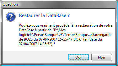 Attention, vous perdrez toutes les données dans la DataBase en cours (la restauration écrase vos données). Dans ce cas, il peut être judicieux de créer une nouvelle DataBase et y restaurer vos données. Notez également, que si vous l'aviez protégée par un mot de passe, celui demandé sera celui en vigueur au moment de la sauvegarde. Cliquez sur Ouvrir pour lancer la restauration. Un dernier message vous demande de confirmer :