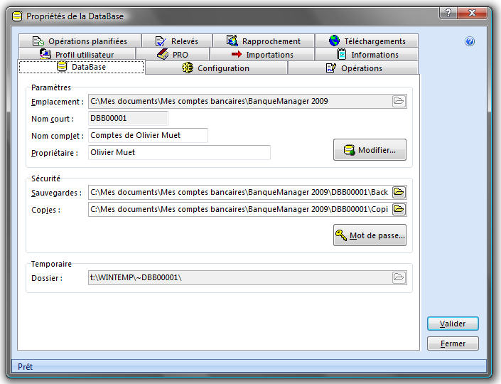 range ses DataBases dans le dossier BanqueManager PortableEdition\Data\. Si vous ne savez pas précisément où se trouve votre DataBase, accédez à ses propriétés à partir du Menu principal de BanqueManager + Propriétés de la DataBase (ou Ctrl + Entrée) :