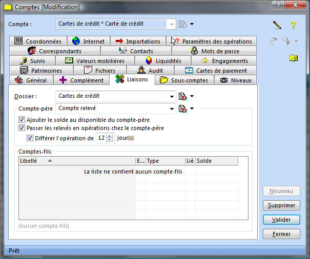 Notez bien que la case "Activer le pointage des opérations" est cochée. Ce n'est pas nécessaire pour saisir un relevé : simplement si cette case n'est pas cochée, vous n'aurez pas à pointer les opérations correspondant au relevé et BanqueManager pointera automatiquement celles antérieure à la date du relevé (sans considération du montant). La case "Autoriser l'équilibrage des relevés" vous permettra de choisir manuellement le montant du relevé et pas simplement à partir du pointage. En effet, si vous choisissez de pointer les opérations des relevés, le montant final du relevé correspond à la somme des montants de la sélection et du dernier relevé. S'il y a un écart, l'équilibrage permettra de le prendre en charge et passera une opération "virtuelle". La case "Ajouter à la date du dernier relevé" permet d'accélérer la saisie d'un relevé en rentrant automatiquement la date du relevé par décalage de la dernière date et de la raison saisie. Si vous recevez par exemple des relevés papier trimestriellement, choisissez d'ajouter 3 mois. Automatiquement, BanqueManager vous proposera une date correcte (ou proche et donc plus aisée et plus rapide à modifier). Ci-dessous la capture d'un compte de type carte de crédit. La plupart des propriétés sont similaires à celles d'un compte courant, mais l'onglet Liaisons présente tout de même une spécificité :