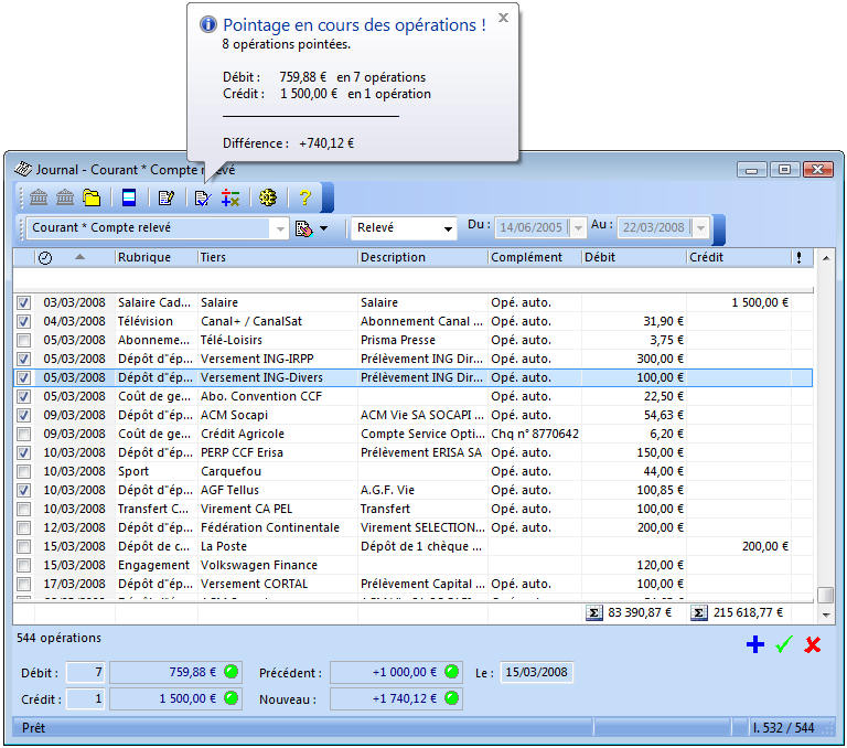 Le passage en mode relevé, provoque un nouveau tri de la grille ainsi que l'apparition de cases à cocher que vous devrez cliquez pour pointer. Notez qu'en temps réel, BanqueManager recalcule le nouveau relevé et vous indique tous les niveaux importants.