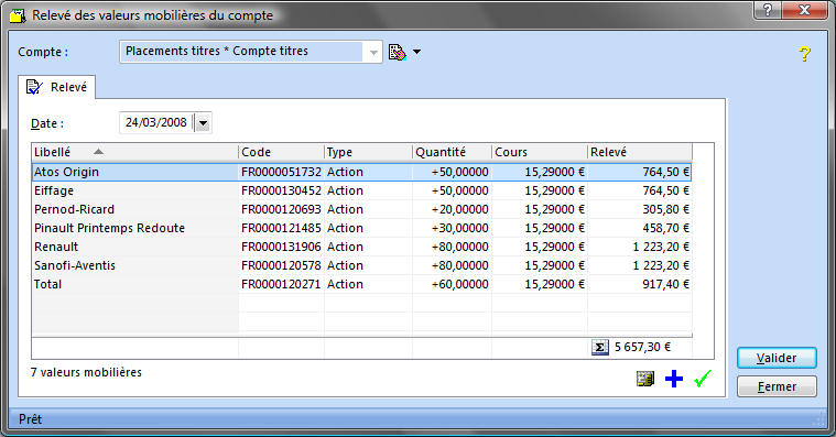 Vous devez vérifier à nouveau la date ainsi que le montant et valider pour confirmer votre choix. Une fois le relevé validé, le journal revient en mode en-cours et les opérations pointées disparaissent. Notez bien que : Dans le cas des comptes non pointeurs, la procédure sera la même sauf que vous cliquerez directement sur le bouton de relevé (sans pointer d'opérations, évidemment !) pour indiquer la date et le montant. Voyons maintenant le cas des comptes titres (ou multi-supports). Ce genre de compte présente quelques spécificités ; en général non pointeur, il nécessite toutefois de connaître les valorisations des valeurs mobilières à la date du relevé. Lorsque vous ouvrez la fenêtre, elle se présente comme suit :