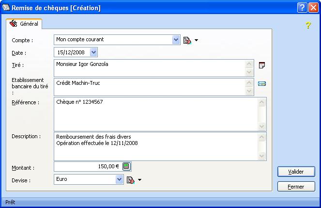 La fiche de saisie des chèques remis (et donc en attente de dépôt) est accessible depuis le menu Gestion + Activité + Remettre des chèques. Supposons qu'un chèque de 150 EUR vient de vous