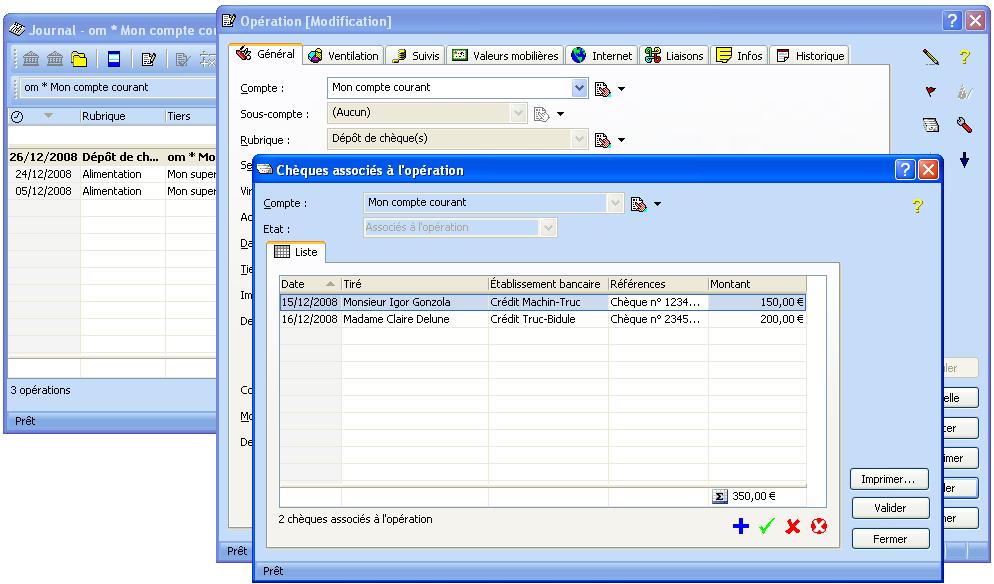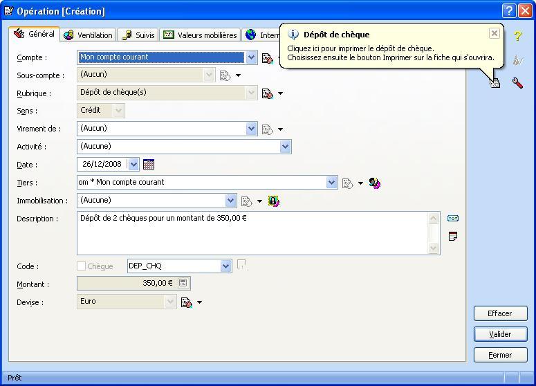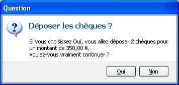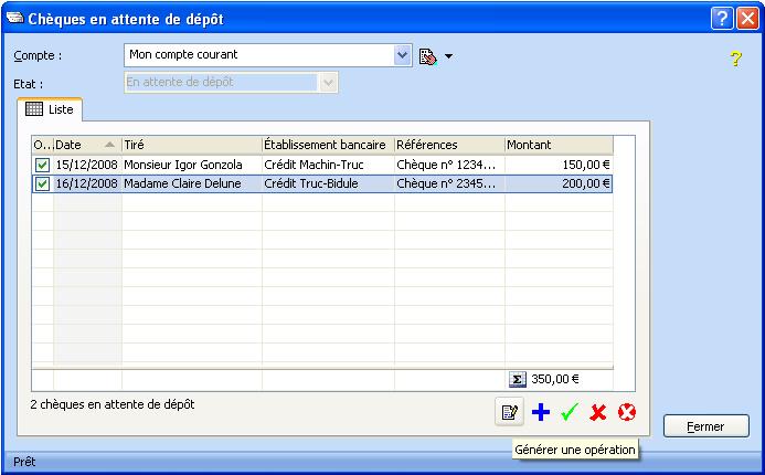 Validez l'opération ; les chèques en attente de dépôt disparaissent alors de la liste. Ils restent cependant encore accessibles depuis l'opération (menu contextuel Accéder aux chèques remis) :